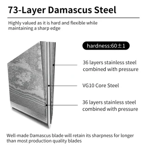 • 36 layers of stainless steel on each side envelop a high carbon steel (VG-10) blade core. Together these form a 73-layered Damascus blade resistant to rust and corrosion.