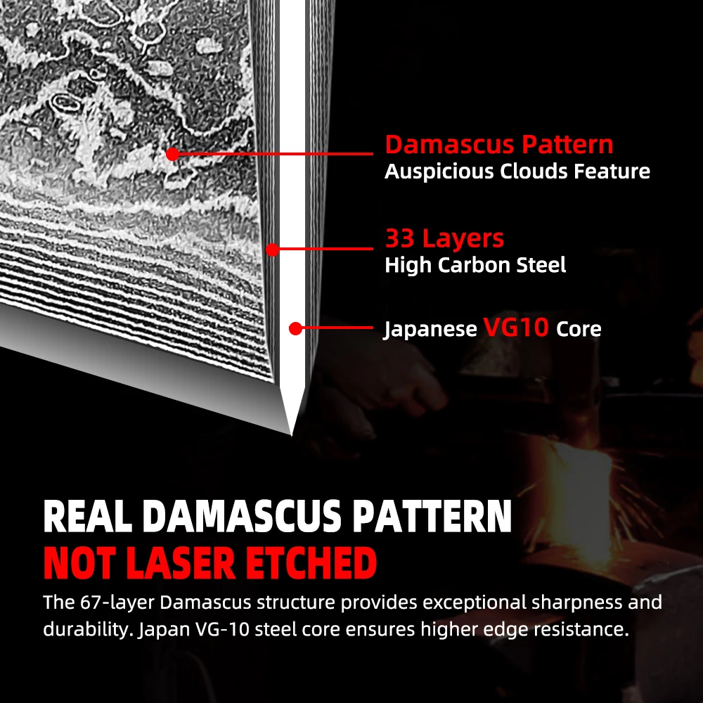 The mirror-polished blades showcase an exquisite Damascus steel pattern, with 67 layers of stainless steel enveloping a high-carbon VG-10 blade core, creating a resilient 67-layered blade resistant to rust and corrosion. Crafted as one solid piece, these knives are sturdy, robust, and designed for daily use, with minimal blade flex and long-lasting sharpness.