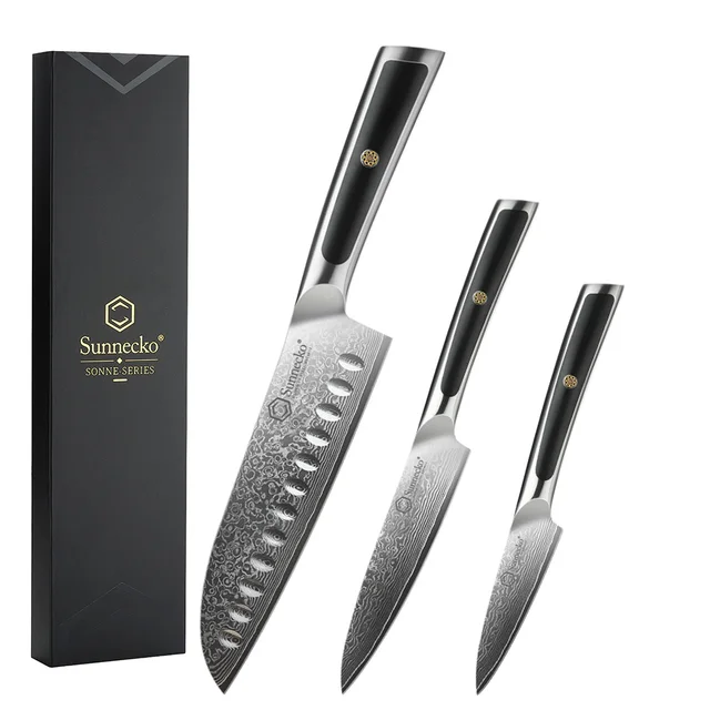 The Elite Style 3 Knives Set (C) from the Sunnecko Elite-A Series combines precision, versatility, and elegance into one stunning package. This premium set features the 7″ Santoku Knife, 5″ Utility Knife, and 3.5″ Paring Knife, all crafted with a VG-10 core and encased in 67 layers of real forged Damascus steel. These knives deliver professional-grade performance with an aesthetic that elevates your kitchen experience.