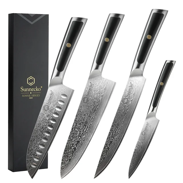 The Elite Style 4 Knives Set (B) from the Sunnecko Elite-A Series is a comprehensive collection of kitchen essentials, including the 7″ Santoku Knife, 8″ Chef Knife, 8″ Slicing Knife, and 5″ Utility Knife. Crafted with a VG-10 core and encased in 67 layers of real forged Damascus steel, this set delivers unparalleled sharpness, versatility, and timeless elegance.
